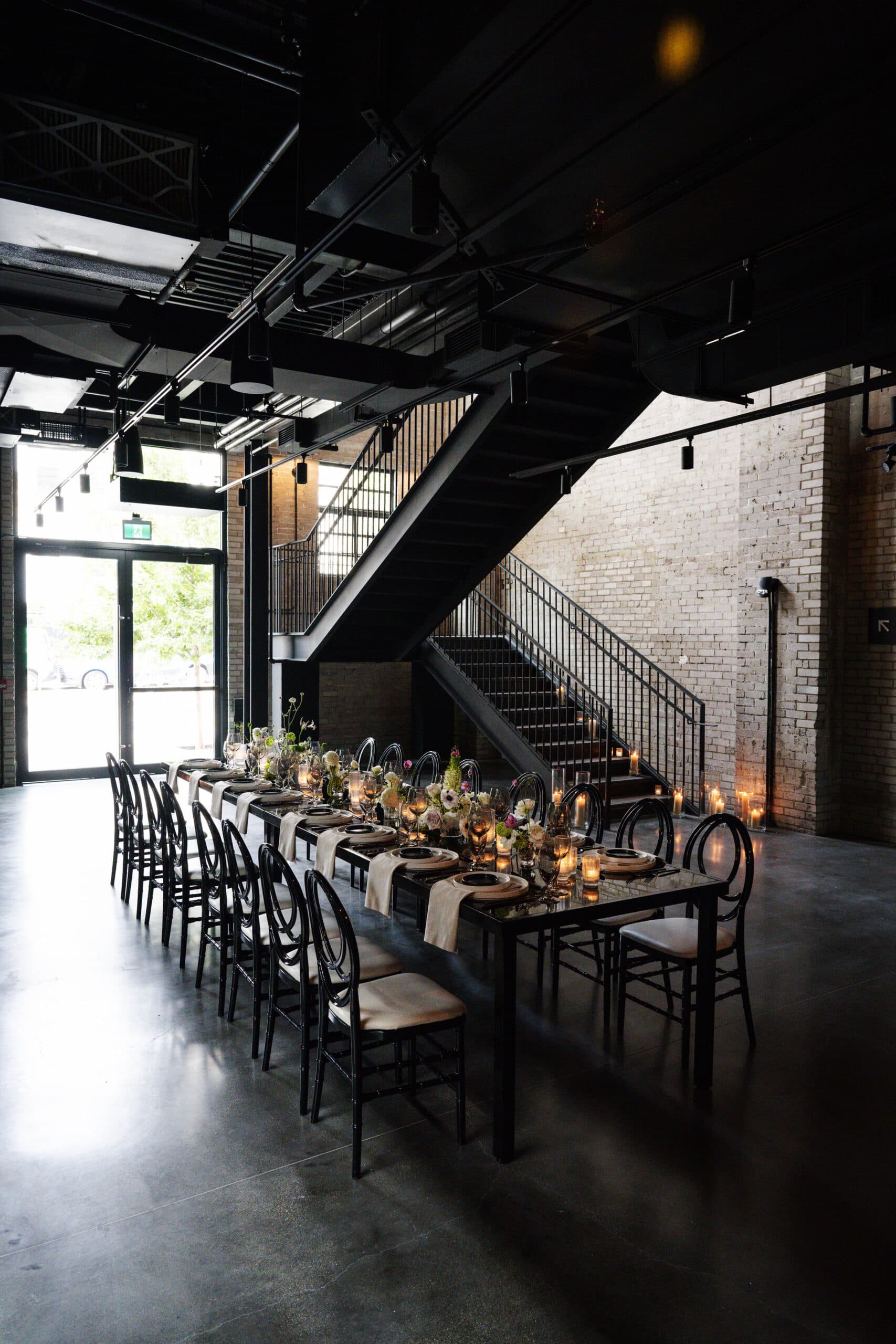 The West Hall is a sophisticated event venue spanning two floors. Welcome your guests in our Reception area off Maud Street, then ascend to the main event space. Sleek polished concrete floors, steel beams and mirrored walls create a contemporary atmosphere within a heritage building. The hall features a private restroom and convenient access to both a guest elevator from the main level and a service elevator from the loading dock. Versatile and adaptable, the West Hall can accommodate a variety of events, from intimate gatherings and formal dinners to product launches and corporate meetings.