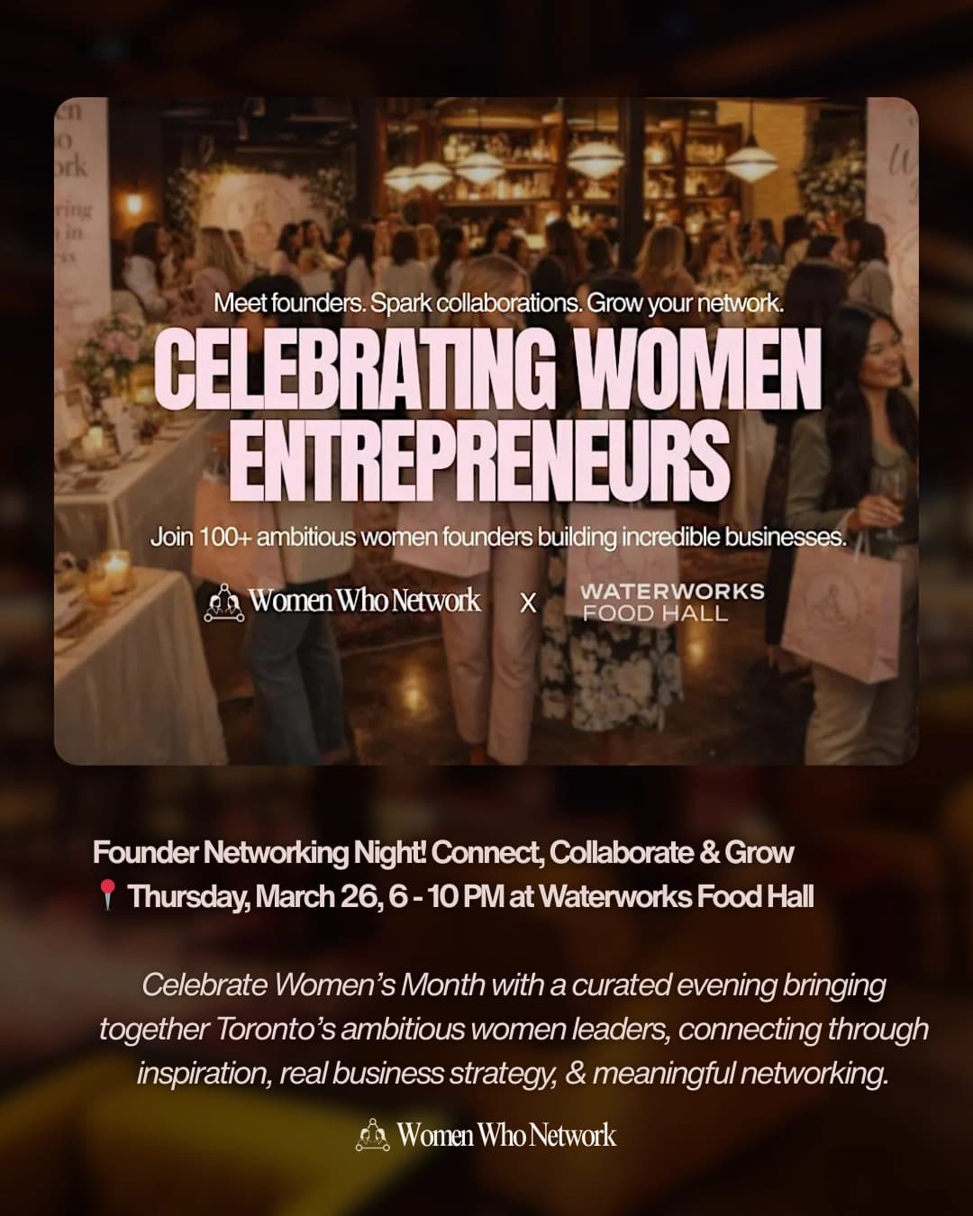 Join 100+ women founders, leaders, and creatives for a powerful evening designed to spark real connection, business growth, and momentum. Hosted by Women Who Network, in partnership with Waterworks Food Hall, this event brings together women building incredible businesses across Toronto for intentional networking, collaboration, and growth.