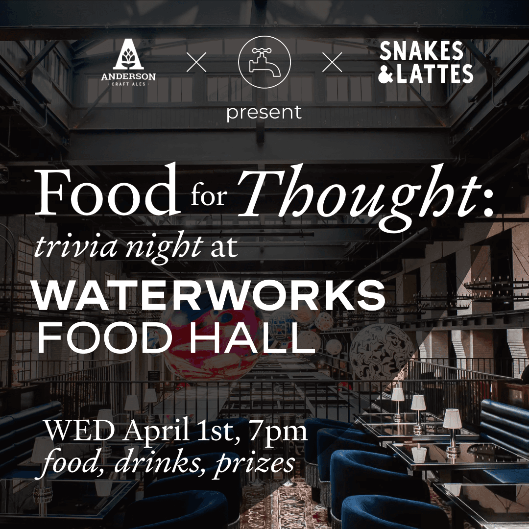 Hungry for some trivia, or got a thirst for knowledge? We have got you covered! No foolin’ – come join us on April 1st at 7pm for Food for Thought, a night of trivia fun brought to you by Snakes & Lattes and Waterworks Food Hall. Your ticket includes one drink (Anderson Gold Lager or non-alcoholic juice spritzer), and of course, a chance to compete for prizes from Snakes & Lattes, Anderson Craft Ales, and a $100 Gift Card to Waterworks.